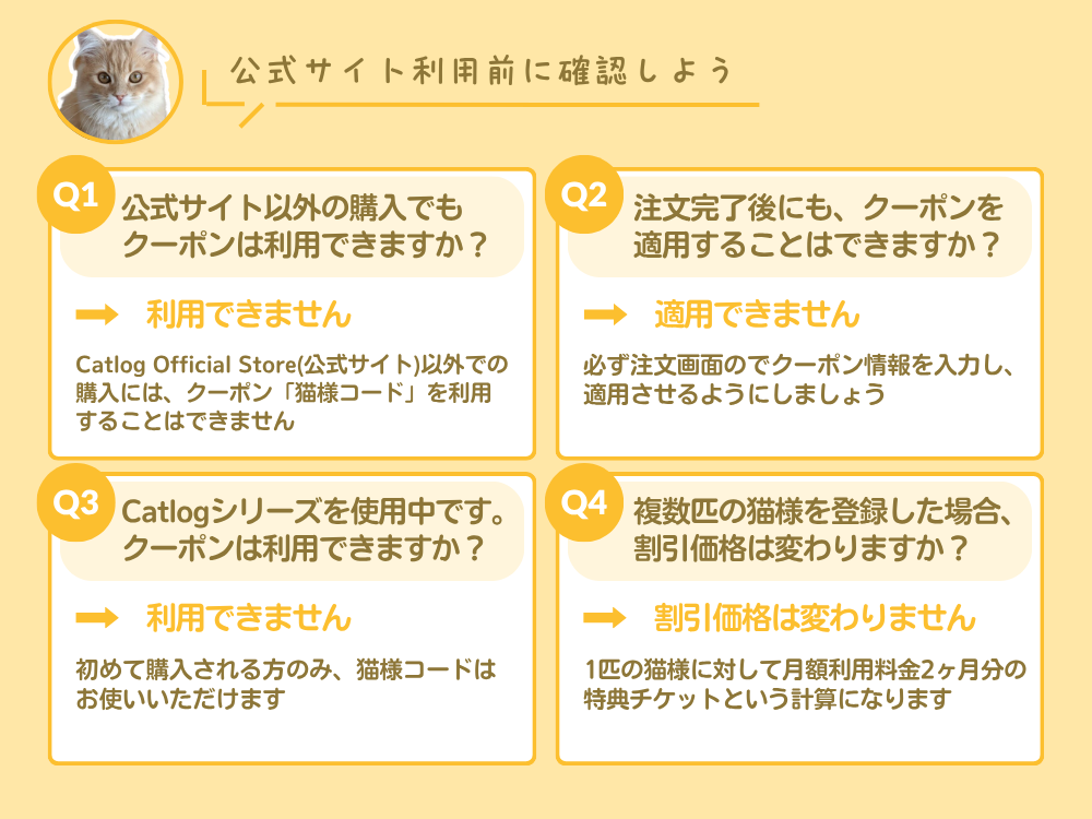 Catlog Official Store(公式サイト)以外での購入には、クーポン「猫様コード」を利用することはできません